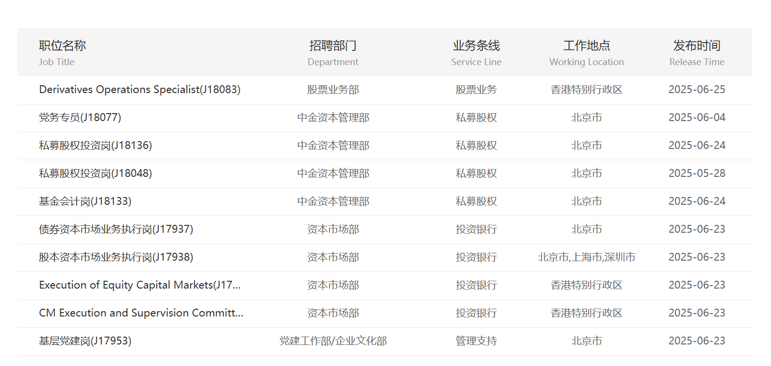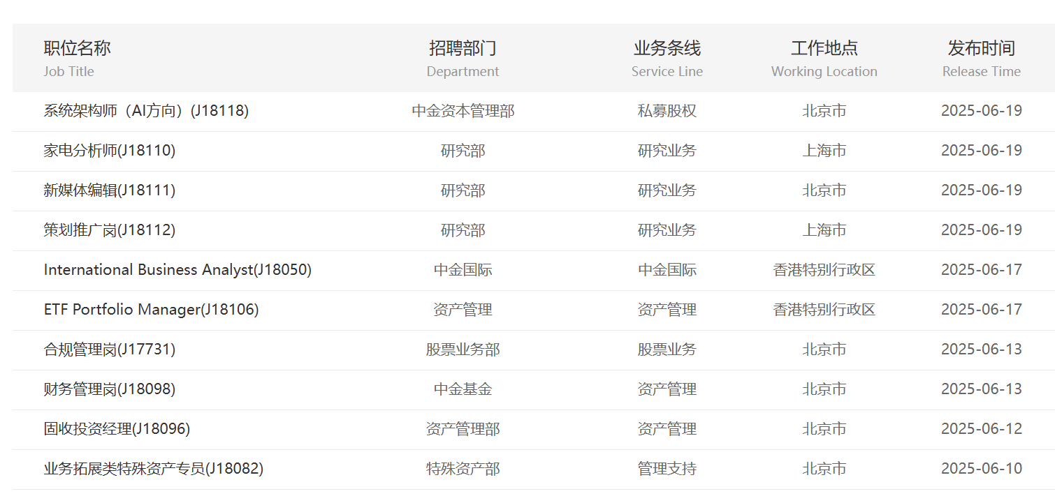 如6月以来,中金公司陆续发布多个社会招聘岗位。下图为中金公司官网社会招聘栏目截图。6月23日,中金公司资本市场部、中金资本管理部、党建工作部/企业文化部、研究部等均释放了岗位需求。工作地点主要位于北京、上海、深圳、香港特别行政区等。