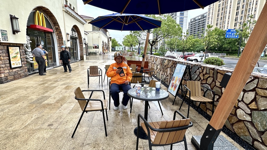 在贤明路的景源商业街上,新改造的宽阔步道已完工,不少商家将外摆桌椅搬了出来。瑞幸咖啡门前,深蓝色太阳伞和原木风桌椅打造出浓浓的“松弛感”,喝咖啡的顾客和等待送单的外卖小哥三三两两地坐在桌边。
