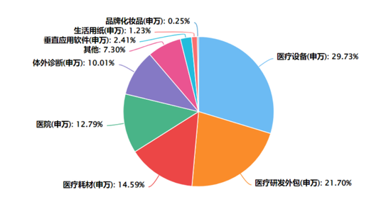 反观A股两只医疗器械指数就有一定的差别。细分到申万三级行业,截至7月14日,中证医疗指数的前三大权重板块是医疗设备(29.7%)、医疗研发外包(21.7%)和医疗耗材(14.5%),另外还有医院板块(12.8%)。