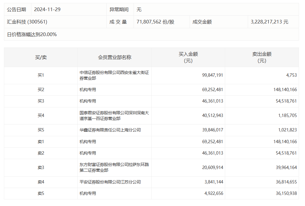 汇金科技今日20cm涨停,三机构净卖出1.18亿元汇金科技今日20cm涨停,三机构净卖出1.18亿元
